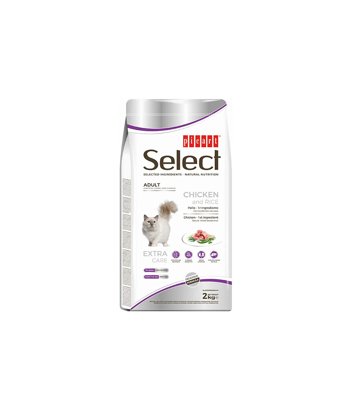 Picart Select 2kg: alimento completo para gatos adultos con pollo y arroz.