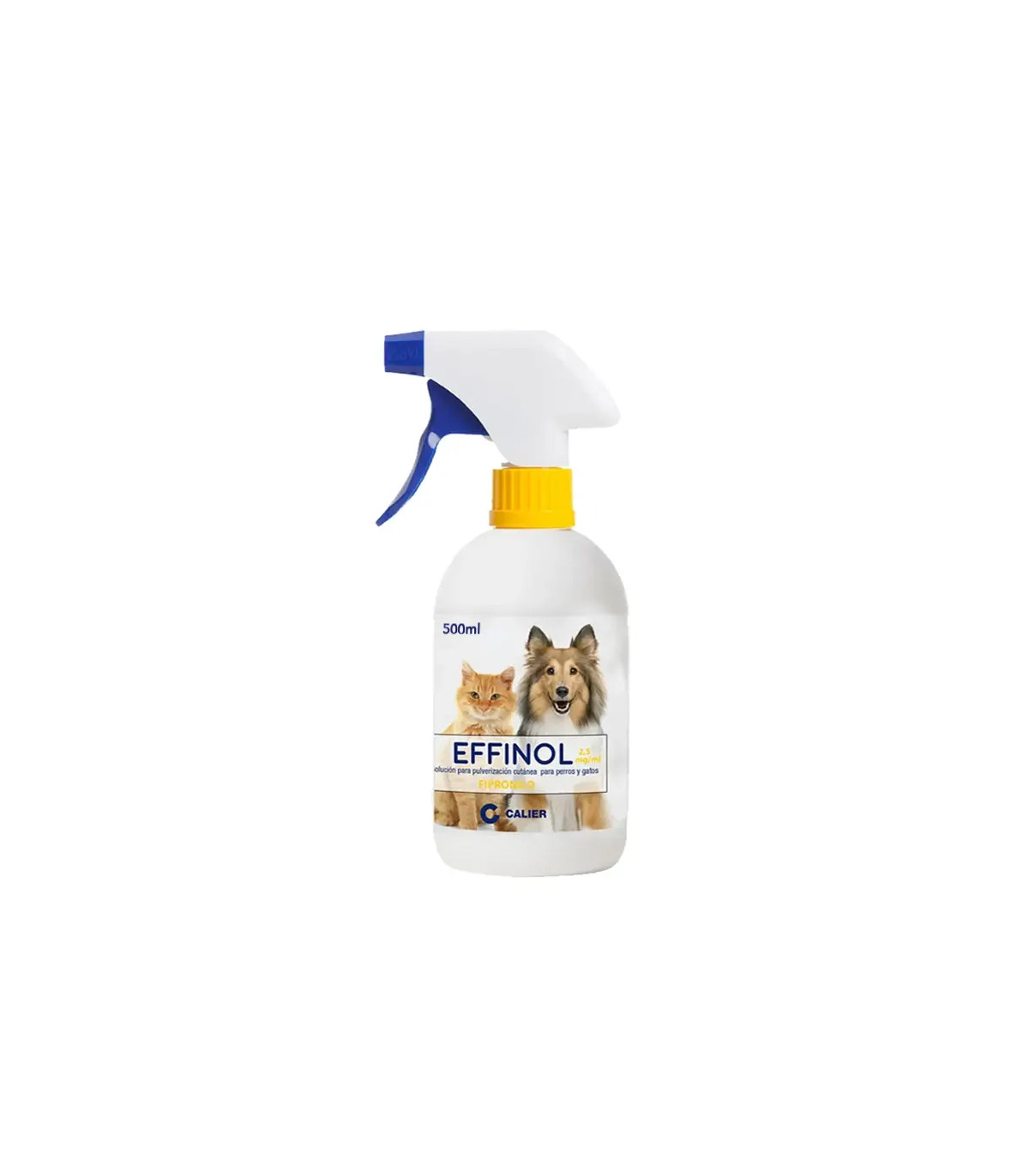 El Effinol Spray 500ml de Calier es la versión ahorro profesional del antiparasitario externo con fipronilo 2,5 mg/ml. Idéntica formulación al formato de 250ml pero en envase doble, diseñado para hogares con múltiples mascotas, criaderos o protectoras que necesitan desparasitar con frecuencia.