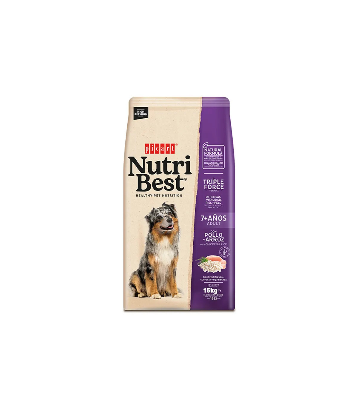 Nutribest Adult 7+ es mucho mas que un simple alimento: es una formula disenada para prolongar la calidad de vida de tu perro. Fabricado en Espana por Picart Petcare, una empresa con mas de 60 anos de experiencia en nutricion animal, cada saco de 15 kg garantiza semanas de alimentacion completa y equilibrada para perros de tamano mediano, con la tranquilidad de saber que estas ofreciendo lo mejor a quien mas te quiere.