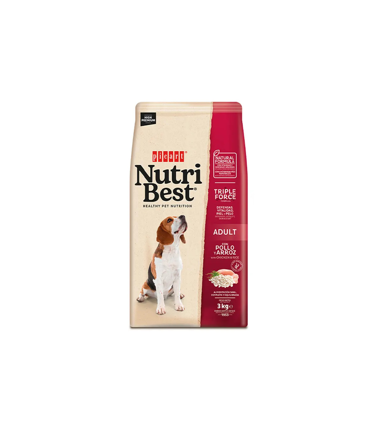 Nutribest Adult con Pollo y Arroz en formato 3 kg es la opcion perfecta para propietarios que buscan un alimento High Premium en un tamano manejable. Formulado por Picart Petcare con la misma receta de alta calidad que el formato grande, este saco ofrece comodidad sin sacrificar nutricion.