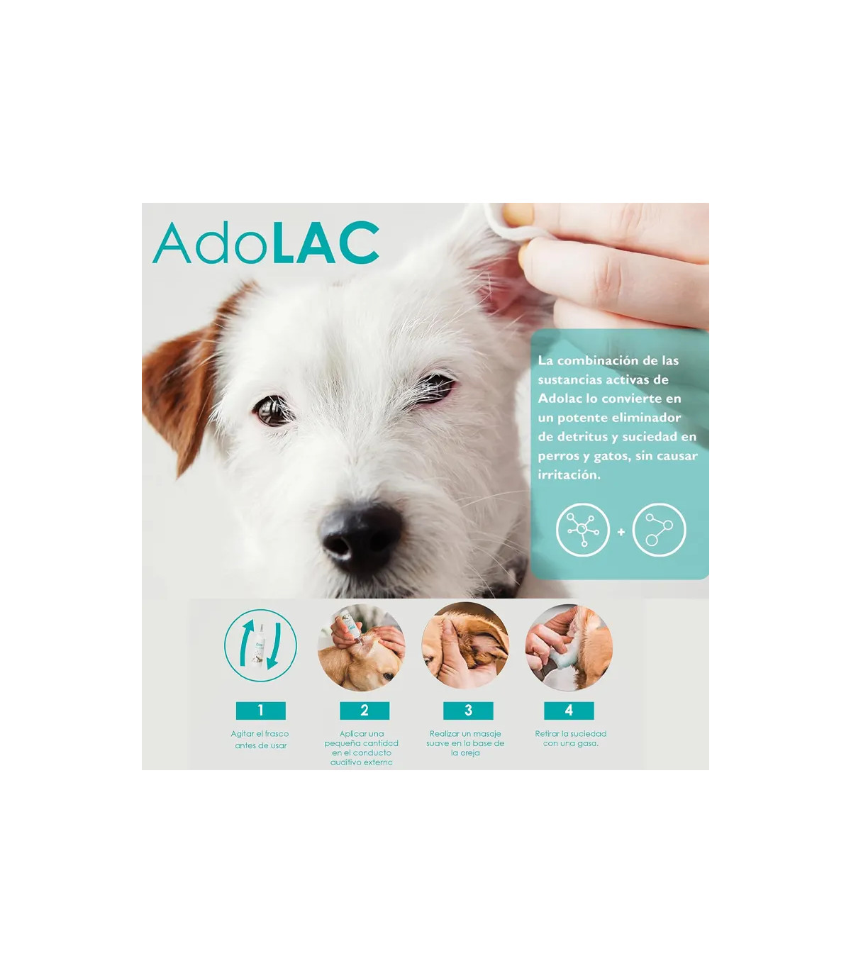 As orelhas limpas são sinônimas com um animal saudável e feliz. O acúmulo de cerume, sujeira e umidade no canal auditivo não só causa mau cheiro e desconforto, mas é a principal causa de otite dolorosa. ADO LAB LAC CALER É o limpador de ouvidos para uso regular que ajuda você a manter uma higiene perfeita e evitar esses problemas.