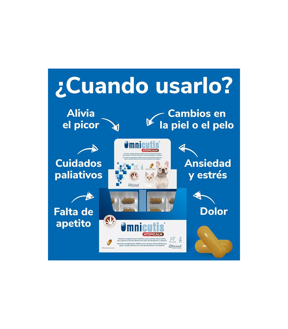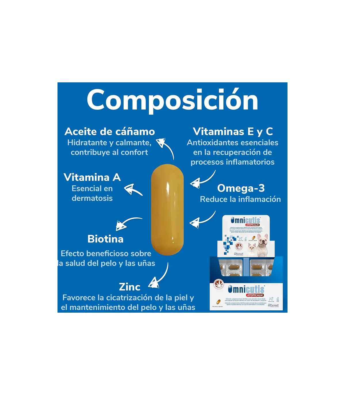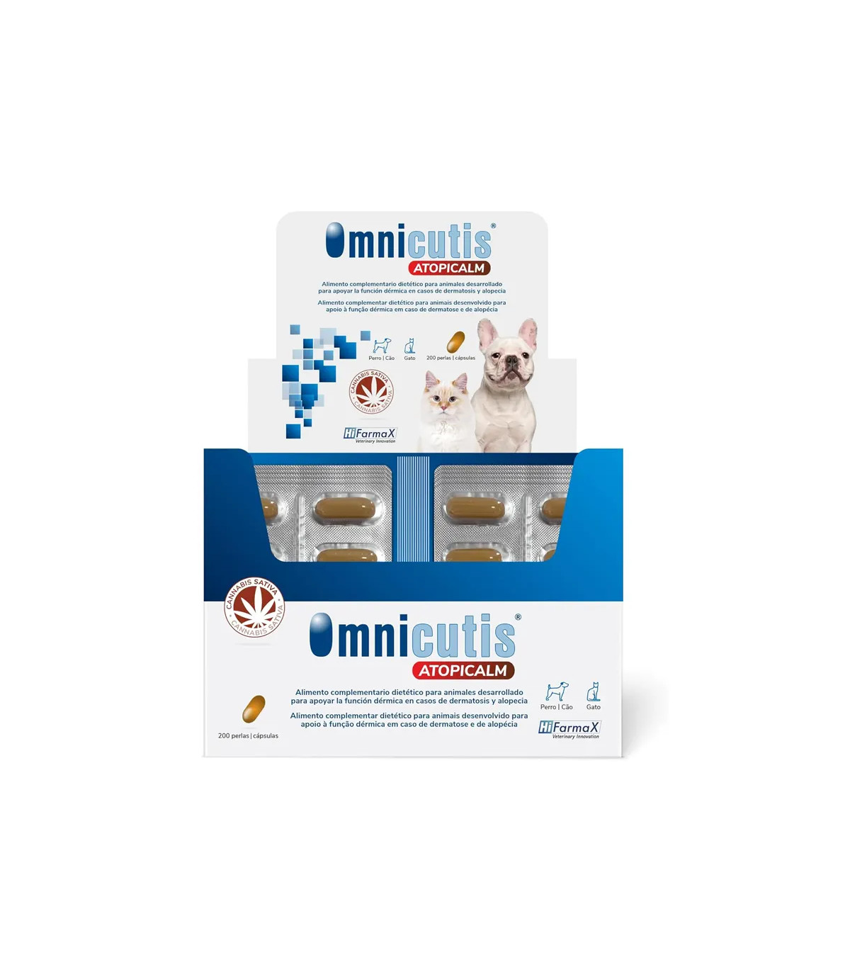 Omnicutis atopicalm (formato poupança 200 pérolas) de hifamax. A opção mais econômica para o Tratamento dermatológico de longo prazo. Este alimento complementar apoia a função da pele em casos de Dermatose, alergias e alopecia. Sua fórmula única com Ômega-3, zinco e óleo de cânhamo Acalme a coceira, hidrata a pele e fortalece o cabelo. Ideal para Cães de raça grandesTratamentos crônicos ou para casas com vários animais de estimação.