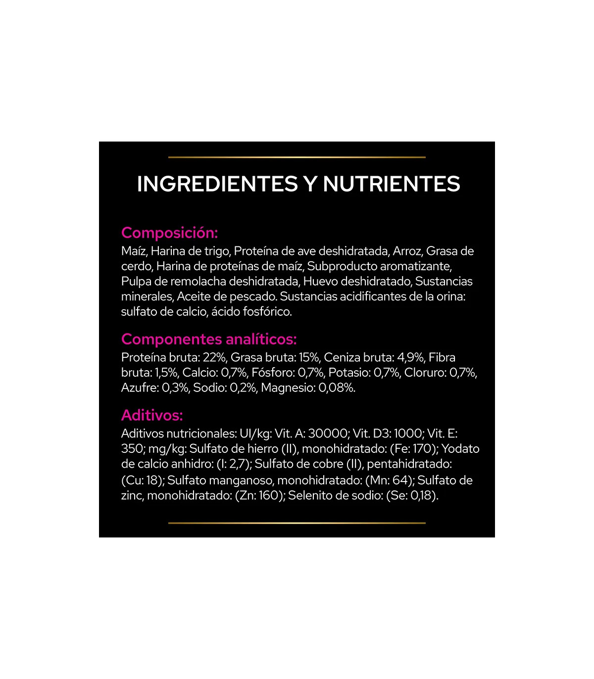 Ingredientes: Milho, farinha de trigo, proteínas pássaro Desidratado, arroz, gordura de carne de porco, farinha de proteína de milho, subproduto aromatizante, polpa de beterraba desidratada, ovo desidratado, substâncias minerais, óleo de peixe.