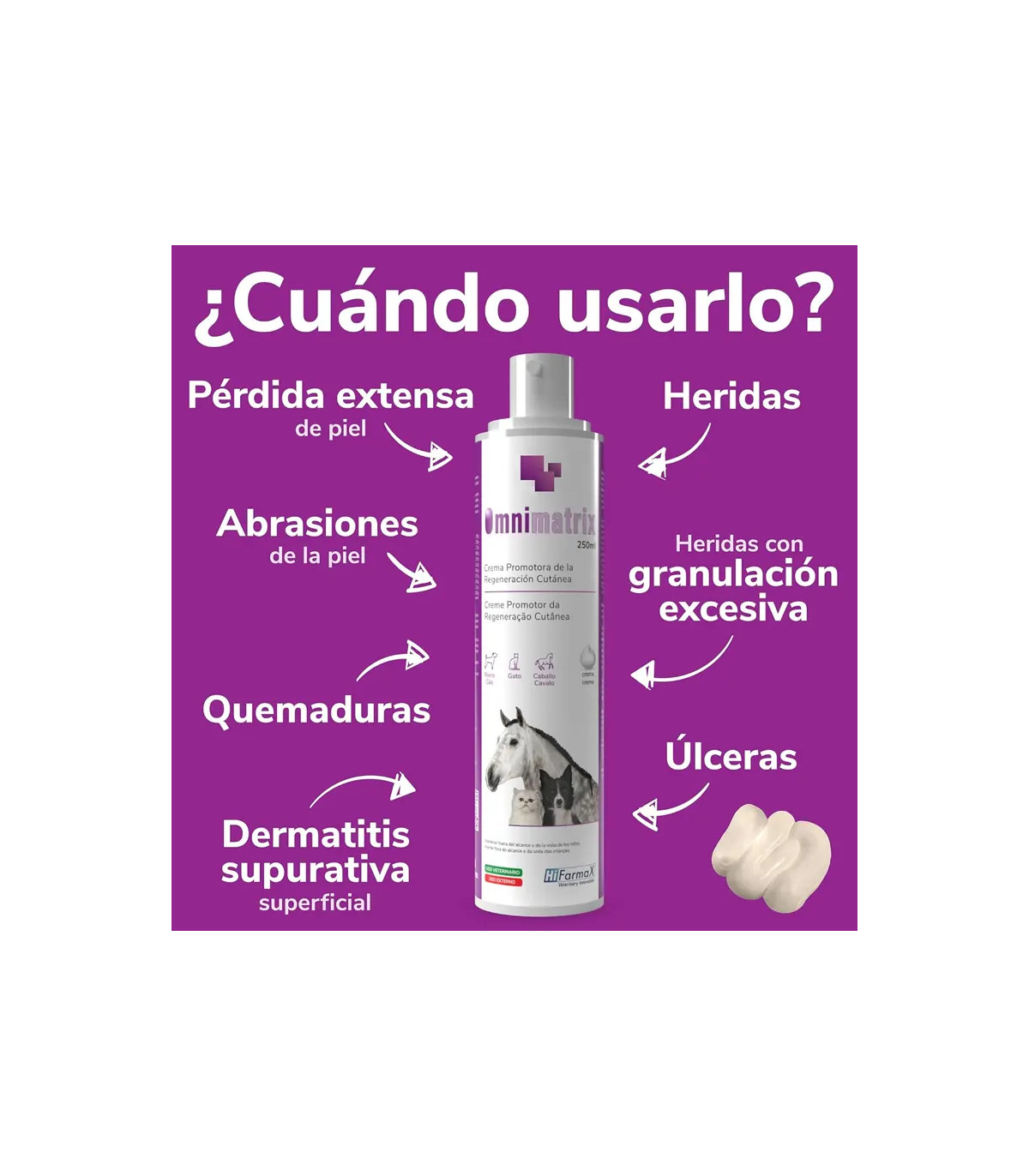 Omnimatrix em espuma (250ml): A apresentação revolucionária da cicatrização do Hifamax. É Espuma de aplicação tópica é ideal para Cães, gatos e, especialmente, cavalos. Perfeito Feridas de grandes áreas, áreas sensíveis ou acesso difícil Não há necessidade de esfregar. Sua fórmula com Óxido de zinco e centro asiático Acelera a regeneração da pele em feridas, queimaduras e cadeira. A solução mais prática e profissional para cuidados avançados.