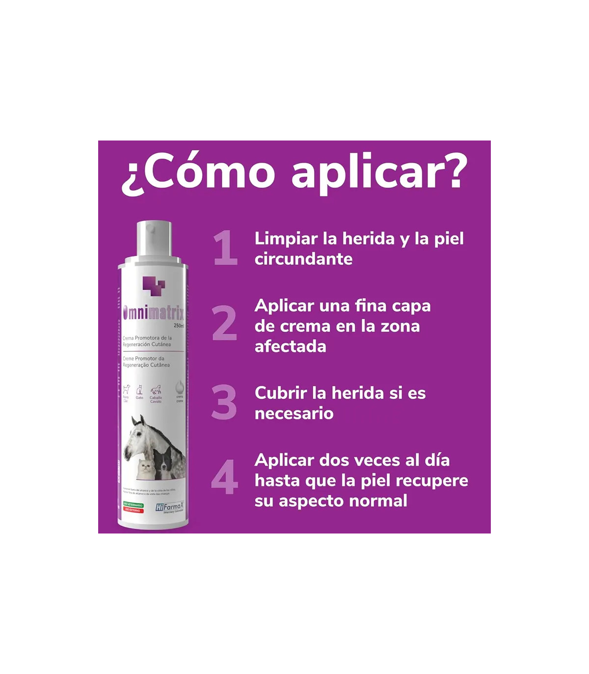 A aplicação de extensos tratamentos de feridas, em áreas com muito cabelo ou em animais sensíveis pode ser um desafio. Pensando nessas situações, o Hifamax desenvolveu Omnimatrix em formato de espumauma apresentação inovadora que facilita o máximo cuidado da pele de Cães, gatos e cavalos.