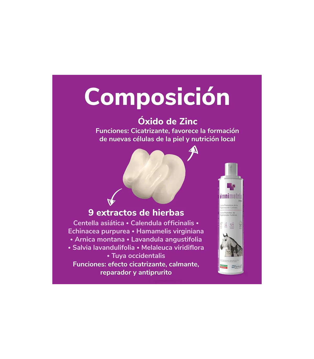 A eficácia da Omnimatrix é baseada em sua composição sinérgica, que inclui Óxido de zinco, lanche asiático, Calendula, Hygeric, Tea Tree e outros 6 extratos de plantas medicinais, que fornecem propriedades anti-sépticas, anti-inflamatórias e suaves.