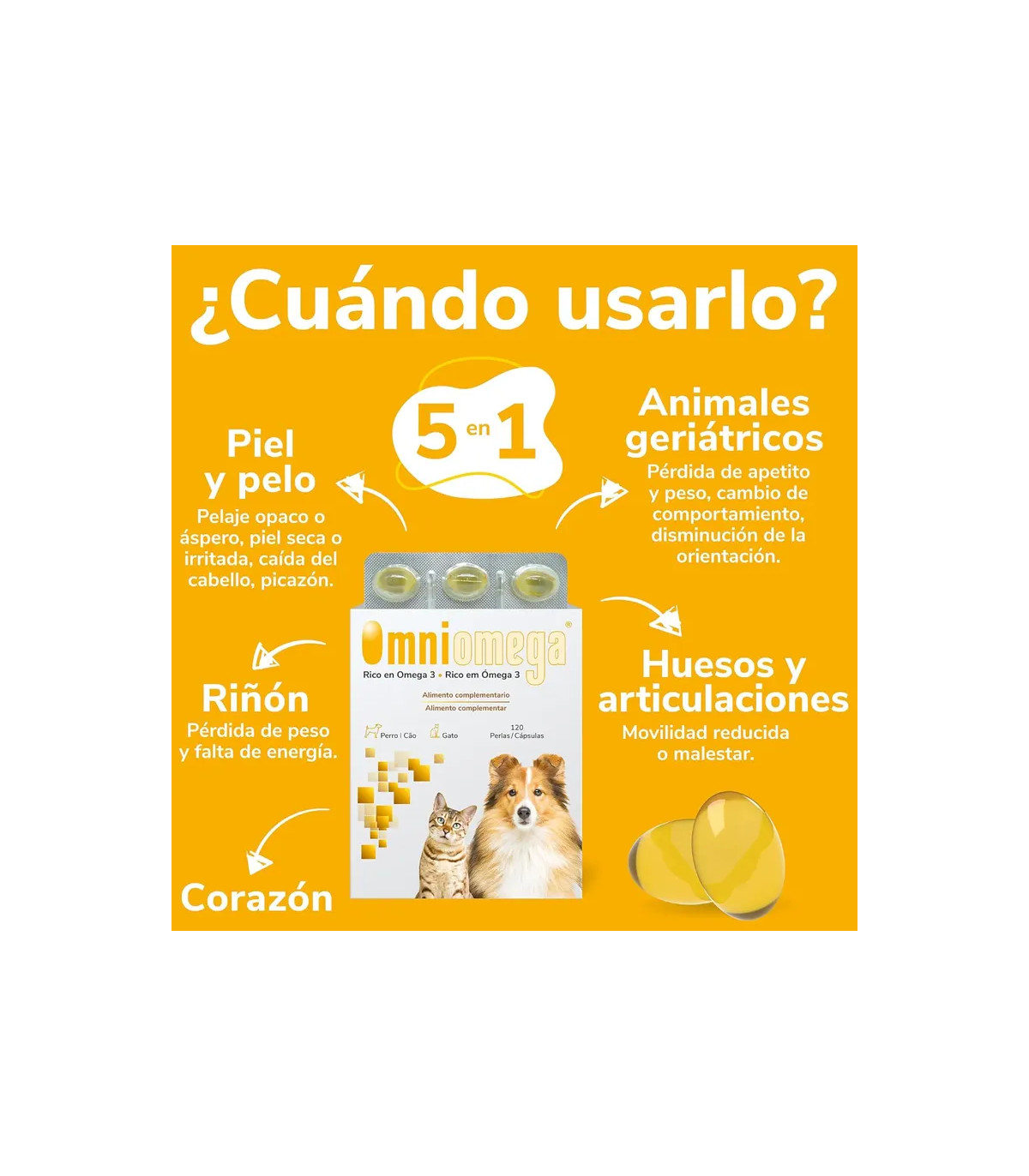 Omniomega de HIFARMAX (120 pérolas) é uma suplemento nutricional alta concentração para Cães e gatos. Sua fórmula rica em Ômega-3 (EPA e DHA) e vitamina E Oferece um suporte abrangente de 5 em 1 para a saúde: Pele, rins, coração, articulações e cérebro. Ideal para melhorar o brilho da pele, aliviar a coceira, proteger a função renal e cardíaca e reforçar as articulações. A dose diária de saúde que seu animal de estimação precisa.