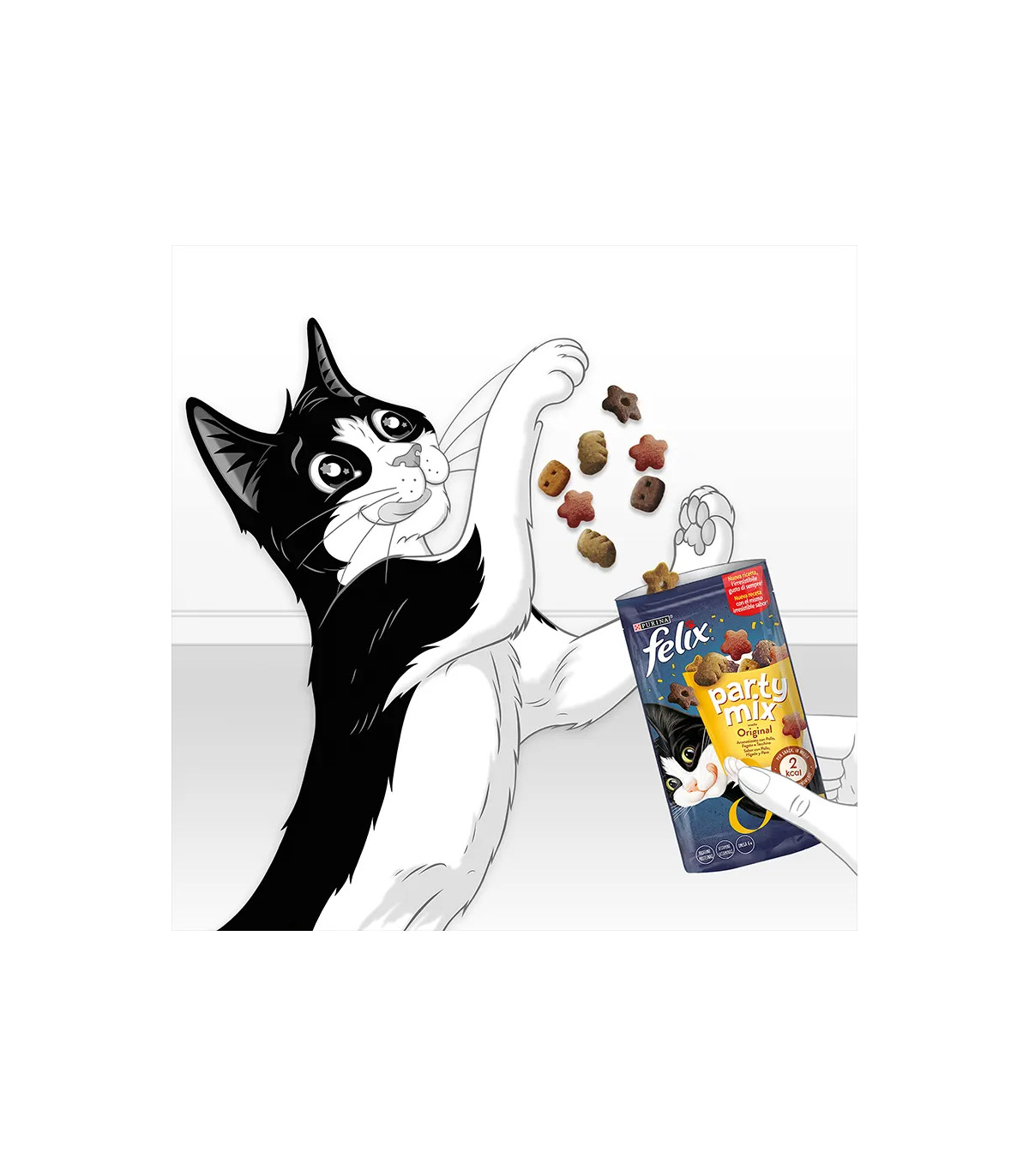 Felix Party Mix é projetado precisamente para tentar os gatos mais exigentes, graças à sua mistura de três sabores carnívoros e suas texturas crocantes e surpreendentes.